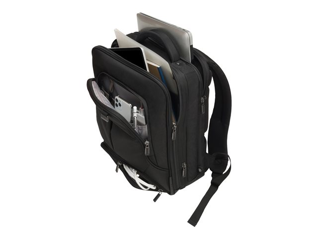 Avec l'Eco Backpack PRO, vous êtes un voyageur de " première classe ". Le sac à dos vous accompagne partout et correspond aux exigences élevées en termes de qualité, fonctionnalité et de protection. L'amour du détail de DICOTA fait de ce sac votre partenaire fiable. La séparation du système fit-all dans le compartiment ordinateur recouvre votre ordinateur, le protège et s'adapte automatiquement aux tailles 15-17,3". La mousse légère en EVA perforée placée dans le compartiment verrouillable de l'ordinateur, protège parfaitement les angles de votre appareil. Tenue optimale pour votre ordinateur portable dans le compartiment, garantie par le revêtement antiglisse. Protection idéale pour votre tablette de taille 12,9"dans le compartiment formé en EVA avec doublure extra douce en Nylex. Espace de rangement généreux pour une imprimante, un projecteur et des documents dans le compartiment extensible. La poche frontale avec porte-clés et compartiments de rangement organise vos ustensiles personnels et offre de la place pour d'autres accessoires mobiles. Le rembourrage ergonomique du dossier, les sangles réglables en longueur, la poignée confortable et la lanière de fixation garantissent un confort de port optimal. Poche zippée cachée pour le passeport, le portefeuille, etc. Fond de la sacoche en matière étanche. Cela fait de l'Eco Backpack PRO le sac à dos parfait pour tous ceux qui se déplacent souvent et qui souhaitent soutenir la réutilisation raisonnable des bouteilles en PET grâce à une solution de transport écologique.