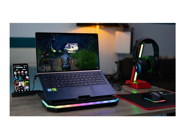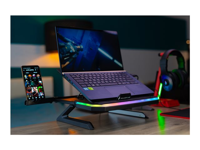 Avec 9 angles de vision réglables, 2 niveaux de hauteur, 2 supports de téléphone, des pieds pliables et un éclairage RGB, le support pour ordinateur portable de jeu Portus X1 positionne tout là où vous en avez besoin pour un jeu optimal.