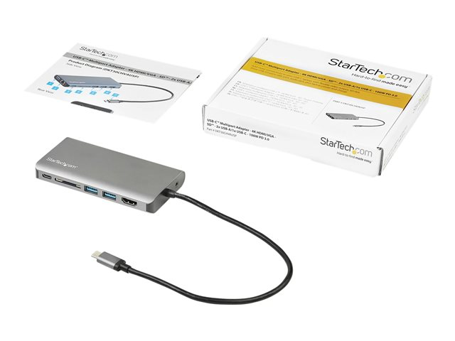 Cet adaptateur multiport USB-C transforme votre MacBook Pro, votre ordinateur portable USB-C ; votre Chromebook ou votre appareil Android (Samsung Galaxy S8, Note 9 et ultérieur) en poste de travail, où que vous soyez. Idéal pour les professionnels en déplacement, cet adaptateur USB Type-C offre toutes les fonctionnalités, des sorties vidéo HDMI ou VGA indispensables aux ports USB, en passant par un lecteur de carte SD et la technologie Power Delivery 100 W avec passthrough Power Delivery. Grâce à un câble hôte unique de 30 cm relié via Thunderbolt 3 ou USB-C, vous bénéficiez d'une plus grande flexibilité pour brancher les ordinateurs portables et tablettes difficiles à atteindre.