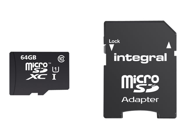Description du produit Integral Smartphone and Tablet - carte mémoire flash - 64 Go - microSDXC UHS-I Type du Produit Carte mémoire flash Format Carte mémoire microSDXC UHS-I Capacité de stockage 64 Go Indice de vitesse Class 10 Adaptateur mémoire fourni Adaptateur microSDXC vers SD Garantie du fabricant Garantie de 5 ans -