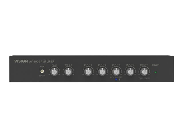 Description du produit Vision AV-1900 amplificateur de table de mixage - 4 canaux Type Amplificateur de table de mixage - alimenté - 4 canaux - rack-montable Réponse en fréquence 50 Hz - 18 kHz Alimentation fantôme pour micro 48 V Alimentation en sortie / Total 100 Watt Canaux mic 4 canaux mono Canaux de lignes 3 stéréo Couleur Noir Dimensions (LxPxH) 28.3 cm - 13.5 cm - 4.5 cm Poids 1.2 kg Garantie du fabricant Garantie à vie -