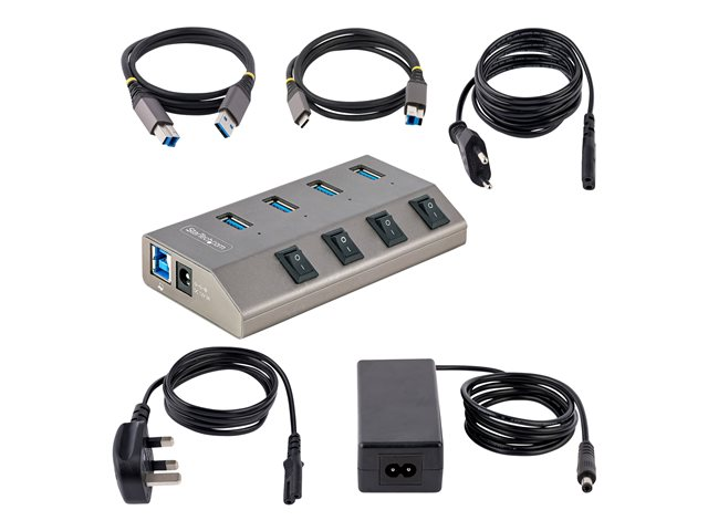 Ce hub USB 3.2 Gen 1 (5Gbps) à 4 ports ajoute quatre ports USB de type A à un ordinateur, avec l'avantage supplémentaire que chaque port dispose d'un interrupteur marche/arrêt individuel. Le hub USB est auto-alimenté par l'adaptateur d'alimentation fourni. Il se connecte à un port USB-A, ou USB-C sur un ordinateur portable ou de bureau.