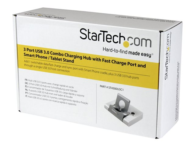 Ce hub USB 3.0 et son socle pour appareil mobile augmentent la connectivité de votre ordinateur portable ou tablette. Il peut être utilisé avec des ordinateurs, des tablettes Windows et certains appareils On-The-Go Android (lorsqu'ils sont couplés à un adaptateur OTG séparé). Vous pouvez maintenant connecter à votre tablette des périphériques utiles comme un clavier ou un disque dur externe.